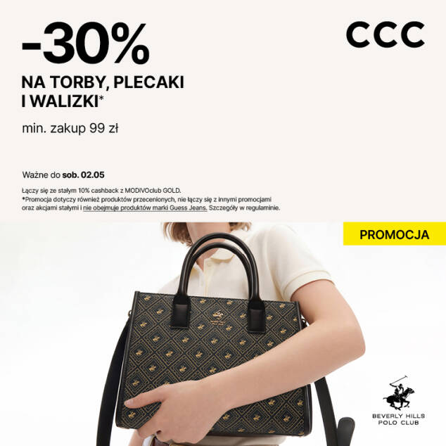 Do pracy, na miasto i na wymarzony urlop! W CCC -30% na torby, plecaki i walizki na każdą okazję! Zrób zakupy za minimum 99 zł, a za stylowe torebki, praktyczne plecaki i modne walizki zapłać 30% mniej! Nie przegap szansy na udane zakupy w CCC! Promocja dotyczy również produktów przecenionych, nie łączy się z innymi promocjami oraz akcjami stałymi i nie obejmuje produktów marki Guess Jeans. Szczegóły w regulaminie.