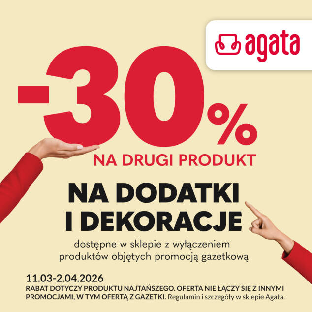 Teraz w sklepie Agata promocja! Rabat 30% na drugi produkt - na dodatki i dekoracje dostępne w sklepie z wyłączeniem produktów objętych promocją gazetkową.