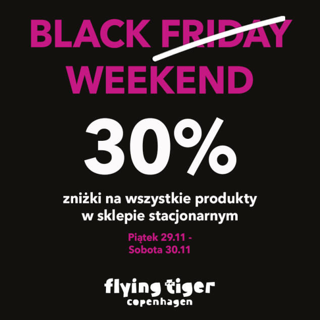 Nie przegap okazji na zakupy w wyjątkowej cenie! Tylko w piątek (29.11) i sobotę (30.11) czeka na Ciebie 30% zniżki na wszystkie produkty w sklepie stacjonarnym Flying Tiger Copenhagen.