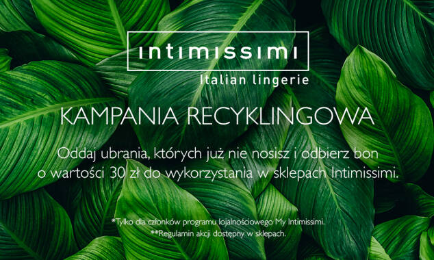 Intimissimi daje Twoim używanym ubraniom nowe życie poprzez wykorzystanie materiałów do produkcji nowych towarów. Kampania recyklingowa zarezerwowana jest dla klientów programu lojalnościowego My Intimissimi. Za każde pozostawione 5 sztuk odzieży, otrzymasz bon o wartości 30 zł. Aby zrealizować bon, wartość paragonu musi wynosić min. 300 zł. Voucher może zostać wykorzystany do 31.12.2022 r. w salonach Intimissimi w całym kraju. Odzież na recykling przyjmowana jest od 01.08 do 30.11.2022 r. Więcej szczegółów w sklepach Intimissimi.