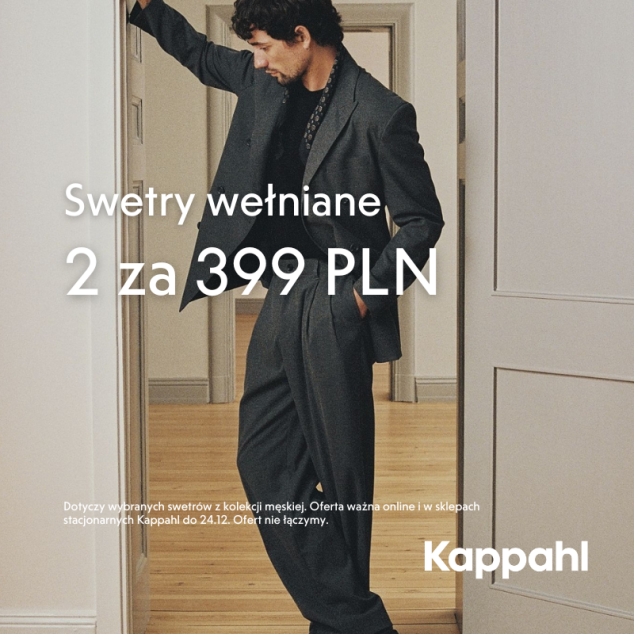 Dotyczy wybranych swetrów wełnianych z kolekcji męskiej. Oferta ważna online i w sklepach stacjonarnych Kappahl do 24.12. Ofert nie łączymy.