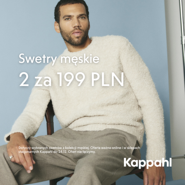 Dotyczy wybranych swetrów z kolekcji męskiej. Oferta ważna online i w sklepach stacjonarnych Kappahl do 24.12. Ofert nie łączymy.