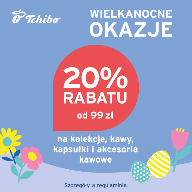 Wybierz swoje ulubione produkty z kolekcji Tchibo – od odzieży i bielizny po asortyment do domu, a także kawy, kapsułki i akcesoria – i skorzystaj z -20% rabatu przy zakupach od 99 zł.