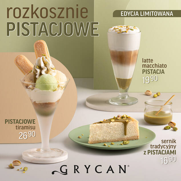 ROZKOSZNIE PISTACJOWE to najnowsza propozycja lodziarnio-kawiarni GRYCAN – Lody od pokoleń. To limitowana oferta, dla której główną inspiracją są cieszące się ogromną popularnością pistacje. Delikatny SERNIK TRADYCYJNY Z PISTACJAMI, kawa LATTE MACCHIATO PISTACJA, a może intrygujący deser PISTACJOWE TIRAMISU?