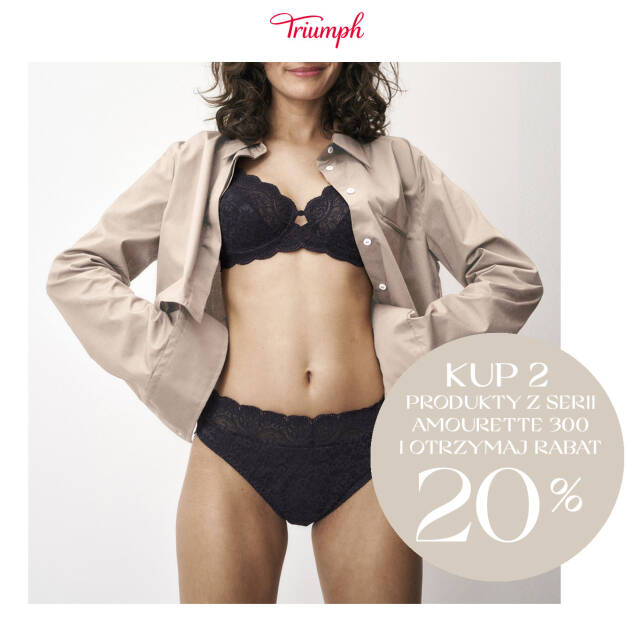 Nasza kultowa bielizna, która doskonale podkreśla sylwetkę. Kup 2 i otrzymaj 20% RABATU* na dowolne biustonosze i majtki Amourette 300 w naszych salonach Triumph!
