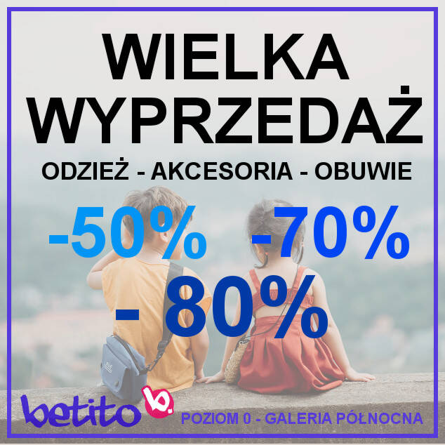 Wielka wyprzedaż odzieży, obuwia i akcesorii dla dzieci. Rabaty do -80%. Ceny poniżej cen hurtowych producentów. Zapraszamy do BETITO na poziomie 0.