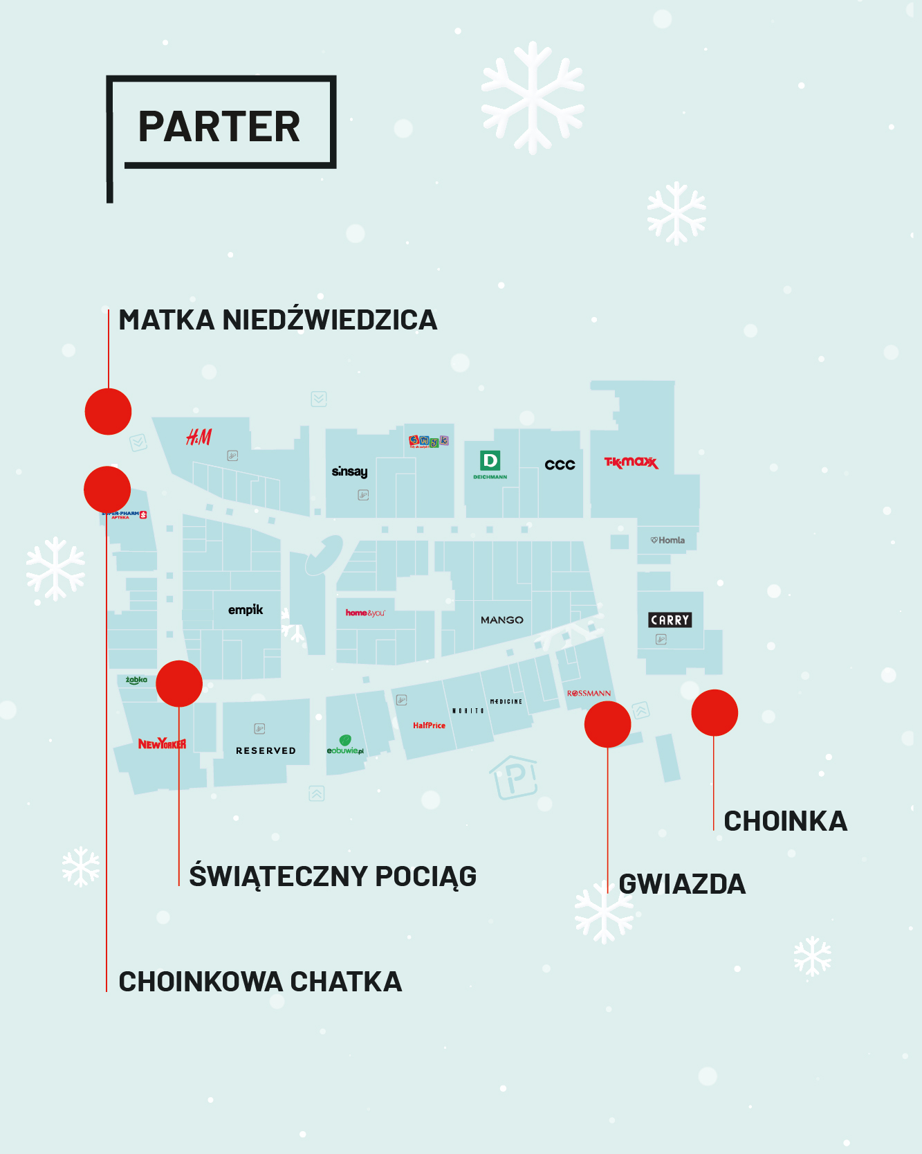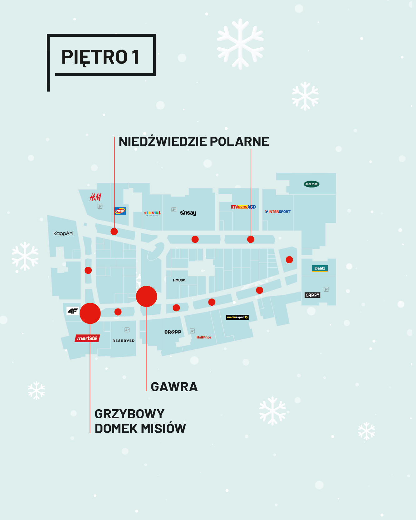 Poczujcie czar zimy i zobaczcie wszystkie nasze dekoracje. Na zewnątrz ustawiliśmy wielką, szpiczastą choinkę, która mruga do Was zapraszająco. Dalej znajdziecie choinkową megabombkę, którą bawią się polarne niedźwiedzie, oraz ciepło rozświetlone gwiazdy. Podpowiadamy tylko, że to świetne miejscówki do zdjęć ze znajomymi lub selfie! We wnętrzu swoje podwoje przed ciekawskimi otwiera domek Mikołaja…w choince. Czy jest zamieszkały? Sprawdźcie!